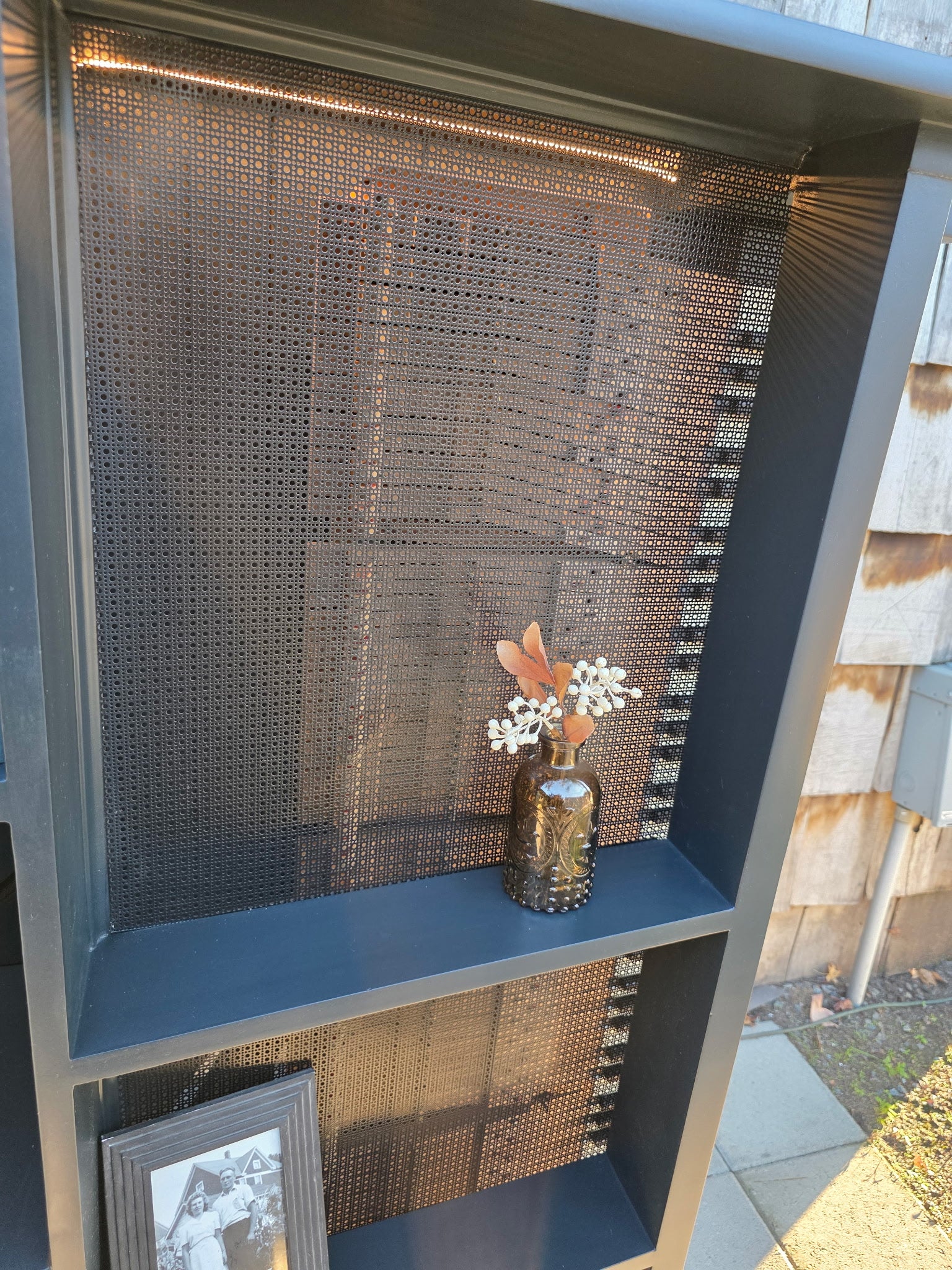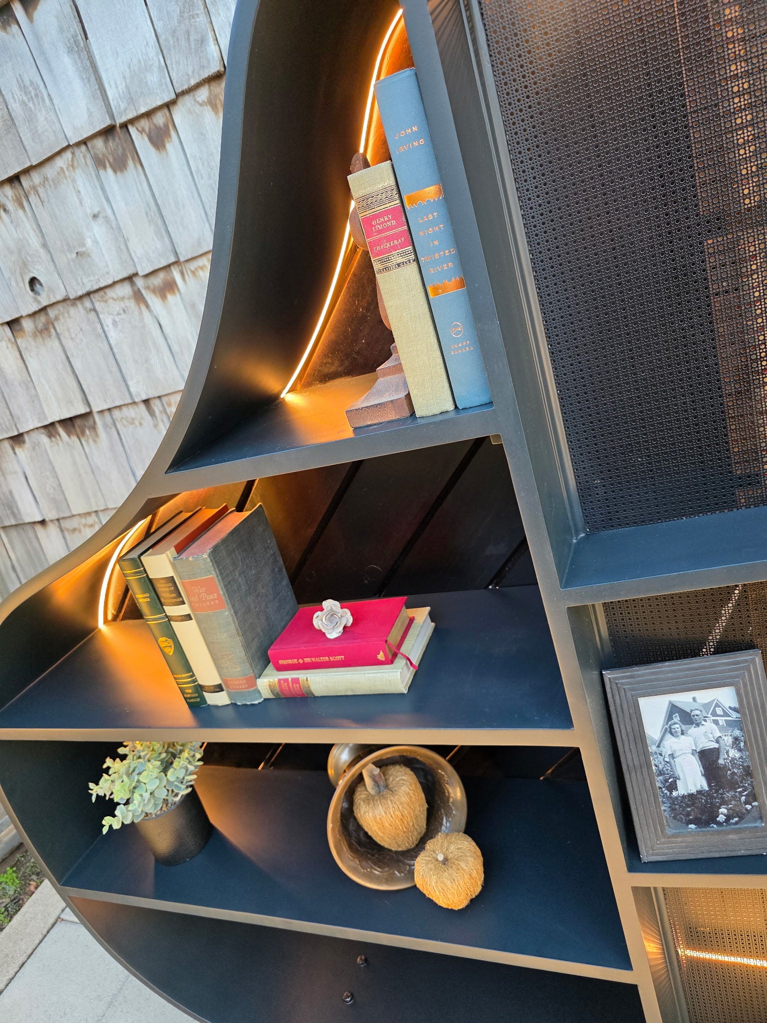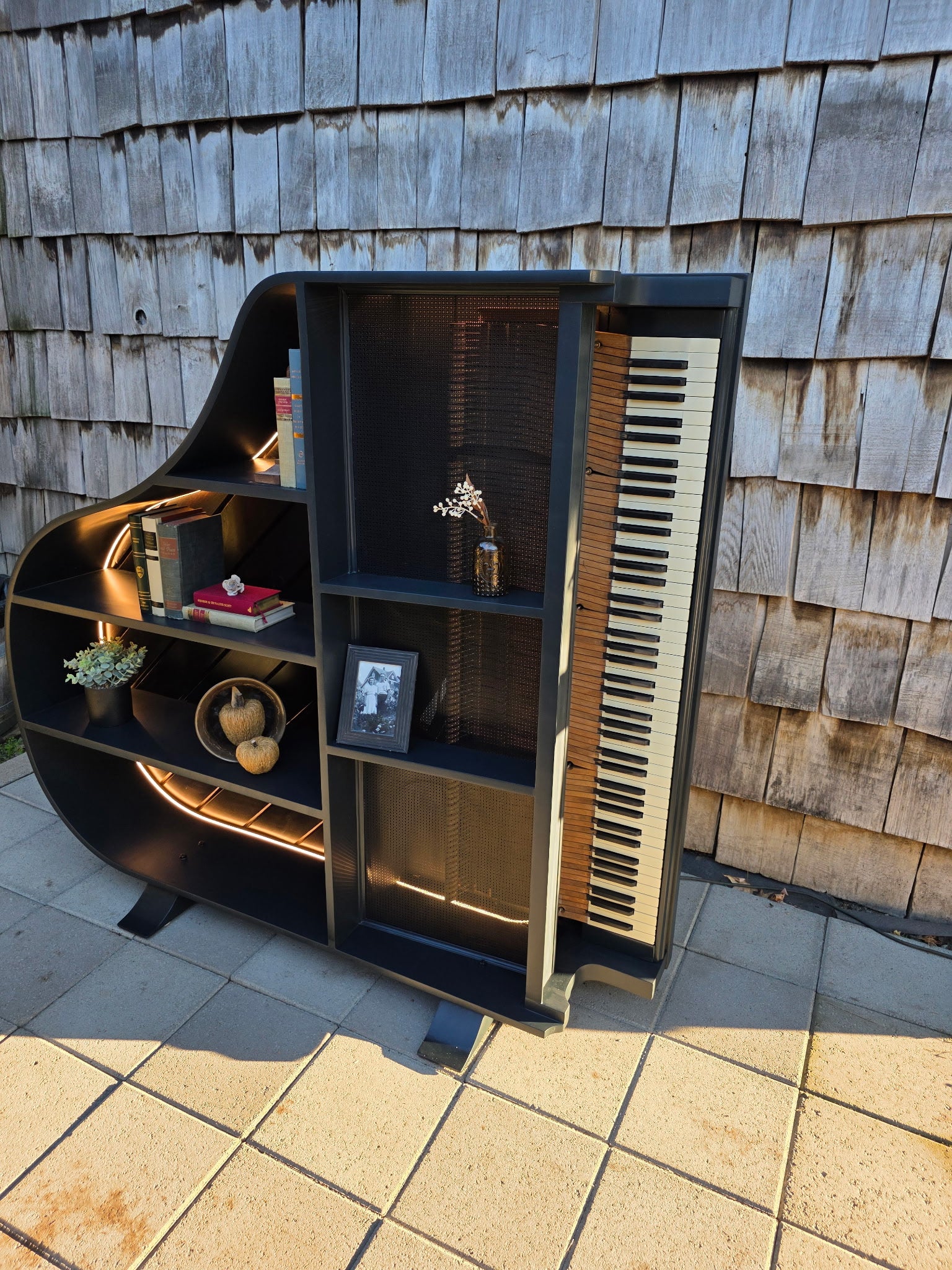 This revitalized piano bookshelf has an exterior stained in a semi-gloss dark walnut. The backing is ship lap also stained in semi-gloss dark walnut. The shelves, cut and trimmed from the lid of the piano and are painted a shade of black called "Inkwell" using Sherwin-Williams Emerald Urethane Trim Enamel with satin finish. The interior is trimmed with LED strip lighting (remote included). The original rustic keyboard is secured in place and the hammers enclosed under a decorative black aluminum grill. The whole bookshelf stands on two feet which were the upper shoulders of two of the original piano legs.