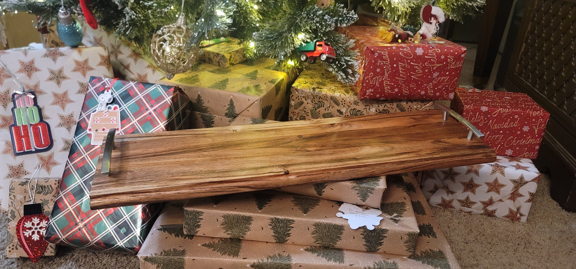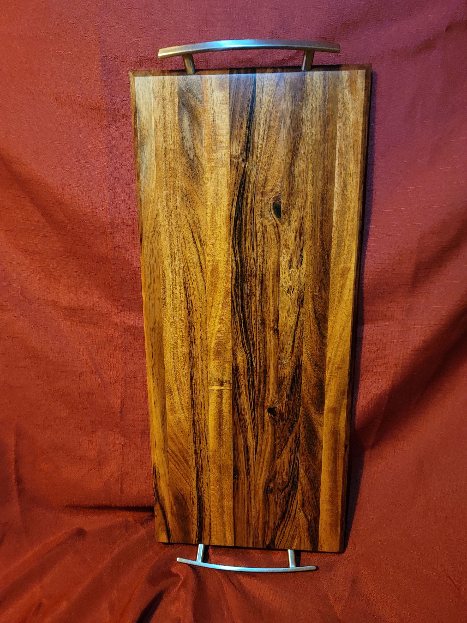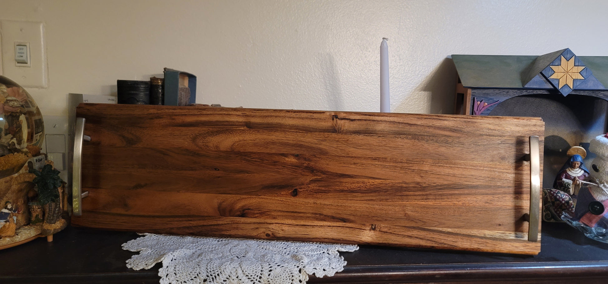 Solid Acacia charcuterie board with chrome handles. Board size is 7 1/8" x 25 1/8" x 7/8"
