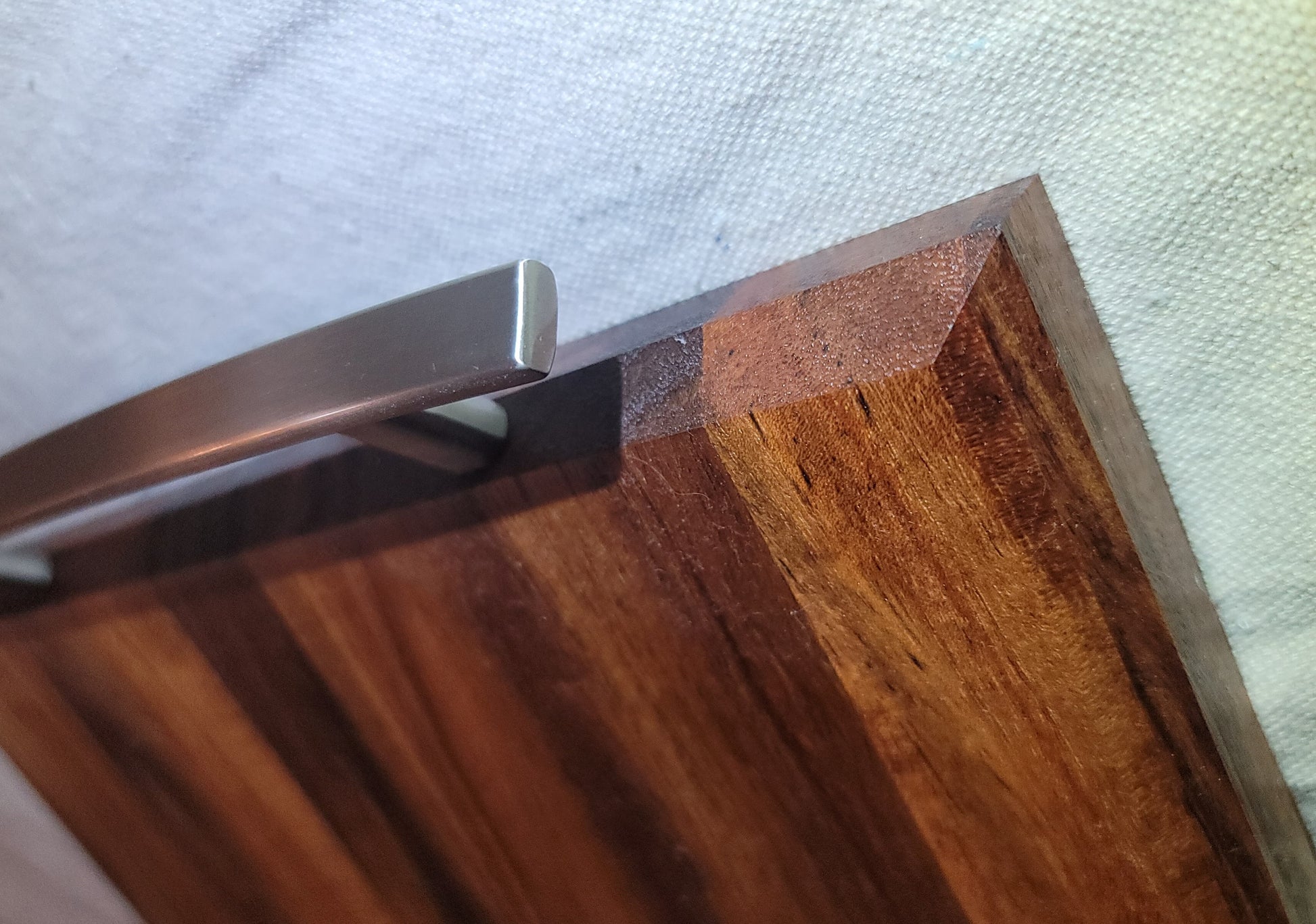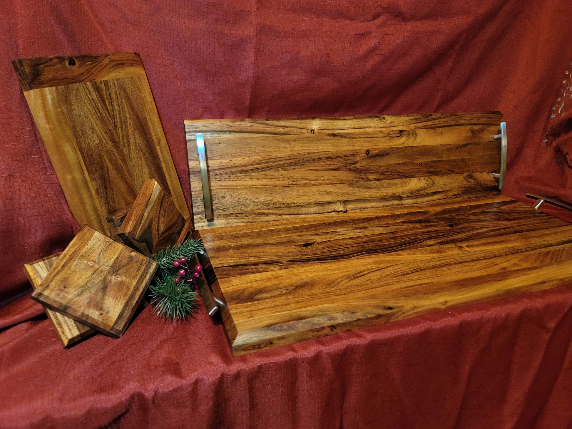 Solid Acacia wood cutting board. Cutting board size is 10 3/4" x 25" x 7/8"